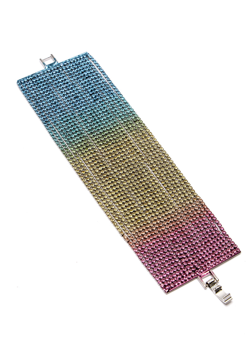Envuelve tu muñeca con pura energía diva. Este amplio brazalete de cuero está cubierto de cristales multicolores, creando un brillo claro que parece sacado directamente de la alfombra roja. Forrado...