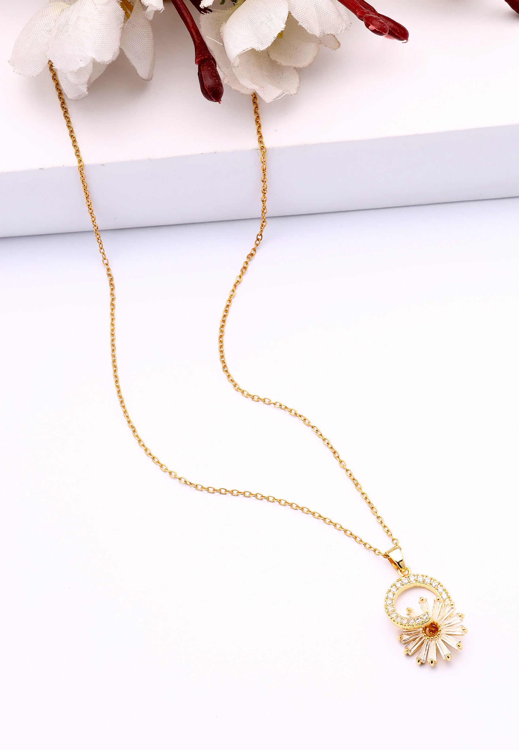Irradia encanto y sofisticación con este deslumbrante collar. El collar presenta un impresionante diseño circular adornado con piedras brillantes, que rodea un cautivador motivo de estallido solar que emana calidez...
