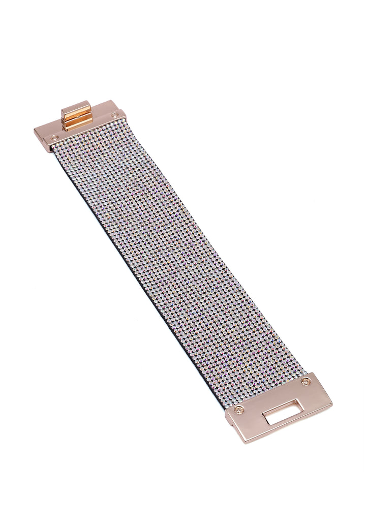 Wrap your wrist in pure diva energy. This wide leather cuff is drenched in multi-coloured crystals, creating a clear shimmer that feels straight off the red carpet. Lined with soft suede and finished with a sleek, high-polish clasp, it’s a bold, luxurious statement piece for nights when you want all eyes on you.
