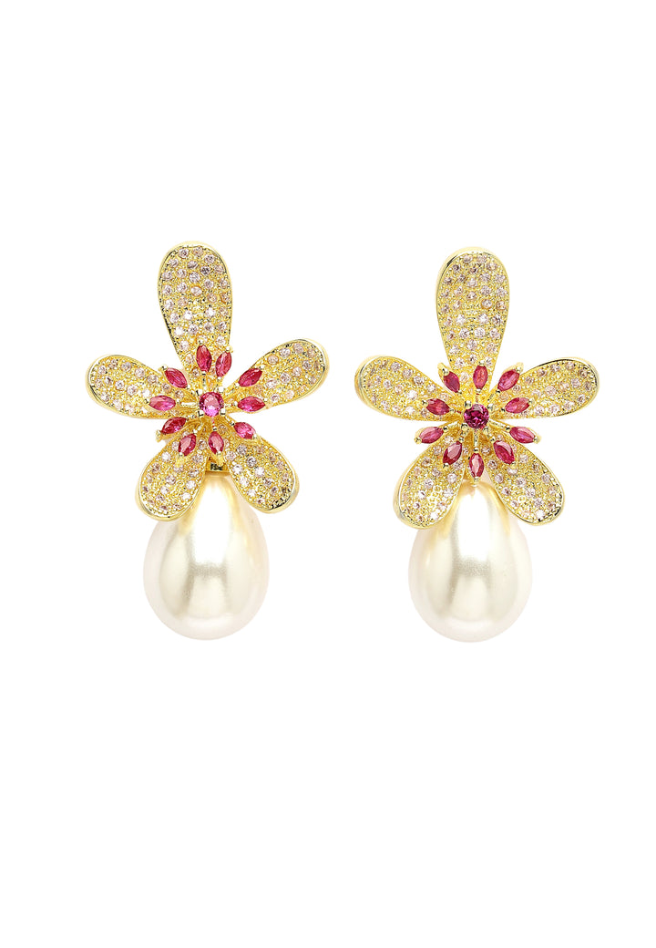 Orecchini a bottone floreali scintillanti con goccia di perla