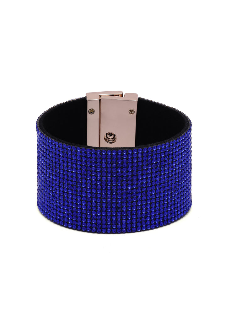 Wrap your wrist in pure diva energy. This wide leather cuff is drenched in blue crystals, creating a royal blue shimmer that feels straight off the red carpet. Lined with soft suede and finished with a sleek, high-polish clasp, it’s a bold, luxurious statement piece for nights when you want all eyes on you.