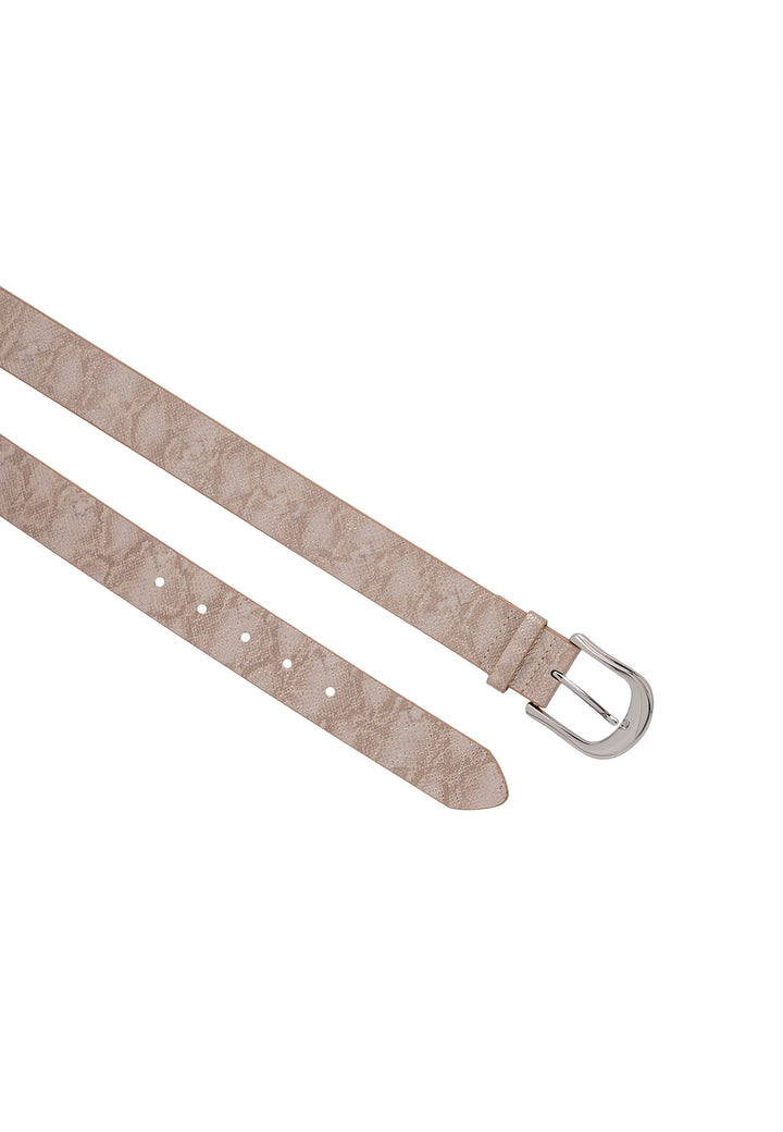 La ceinture imprimée serpent de couleur beige est un accessoire saisissant et audacieux qui incarne une élégance audacieuse. Dotée d'un imprimé complexe inspiré du serpent, la ceinture apporte une touche de mystère et de sophistication audacieuse à votre tenue. L'imprimé peut varier de motifs subtils et doux de petites écailles à des représentations plus vives et stylisées de serpents, offrant à la ceinture un look polyvalent qui peut s'adapter à de nombreux styles différents. Associez la ceinture imprimée serpent à une veste en cuir noire, un jean skinny et des bottines.