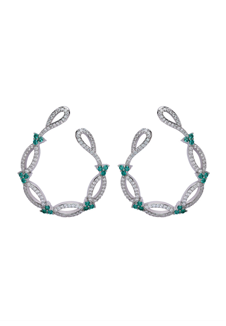 Les boucles d'oreilles Diva Designer Hoops de la Collection Diva présentent des zirconias cubiques en argent avec de petites pierres en zirconia cubique vert. Ces pierres vertes apportent une touche de couleur qui améliore l'esthétique générale et rend les boucles d'oreilles uniques. Leur design unique et leurs pierres scintillantes en font un accessoire polyvalent qui rehausse n'importe quel look avec flair et.