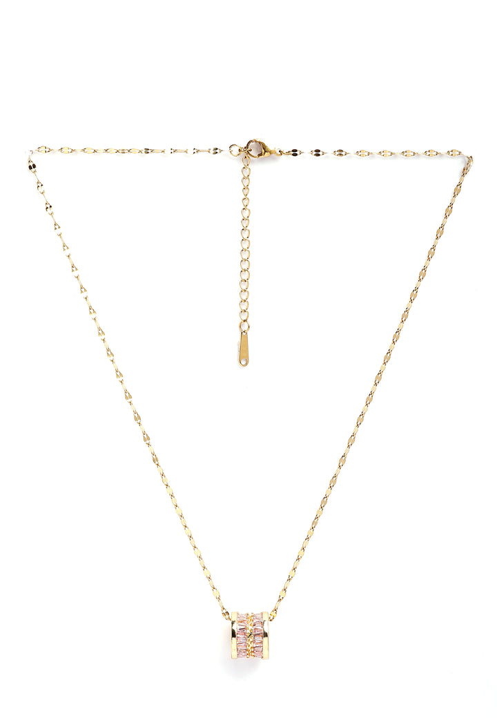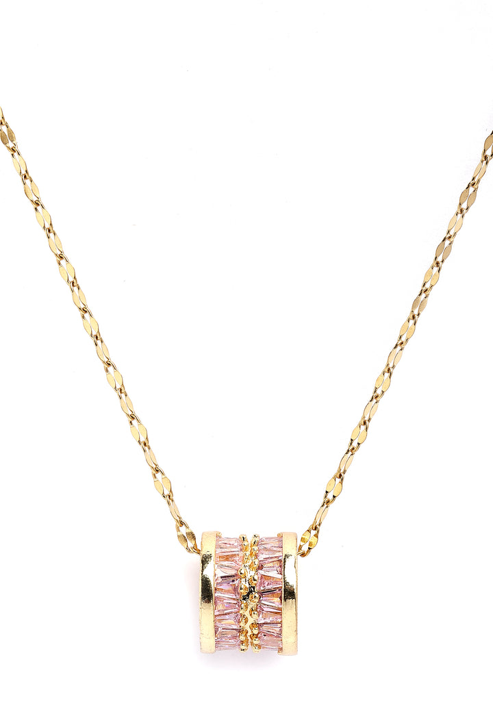 Le collier chaîne enlaidé de cylindre élégant, featuring une chaîne de couleur or avec un cylindre en zircon cubique rose, est une pièce accrocheuse. Le point focal du collier est un petit pendentif en cylindre, enlaidé de pierres en zircon cubique rose. Ce collier est adapté à diverses occasions, des sorties décontractées aux événements formels, ajoutant un charme subtil mais sophistiqué à n'importe quelle tenue. Portez-le seul pour un look minimaliste et raffiné. Ce collier est sûr d'être une pièce remarquable, alliant élégance avec une touche de couleur et un design moderne.